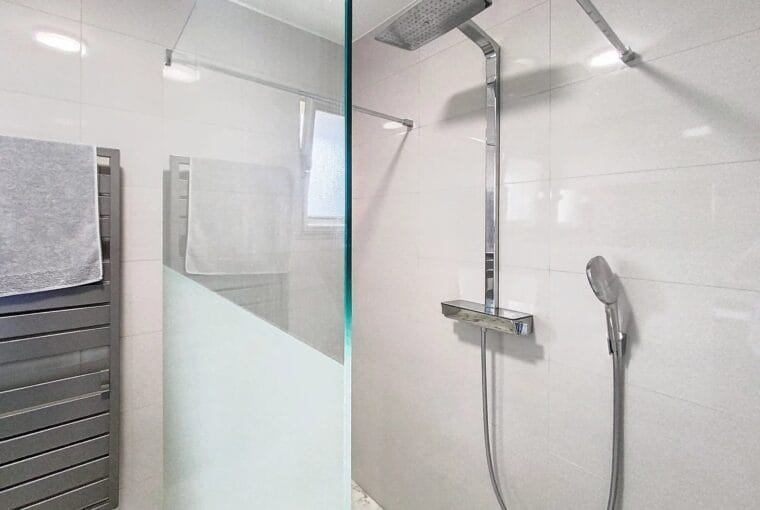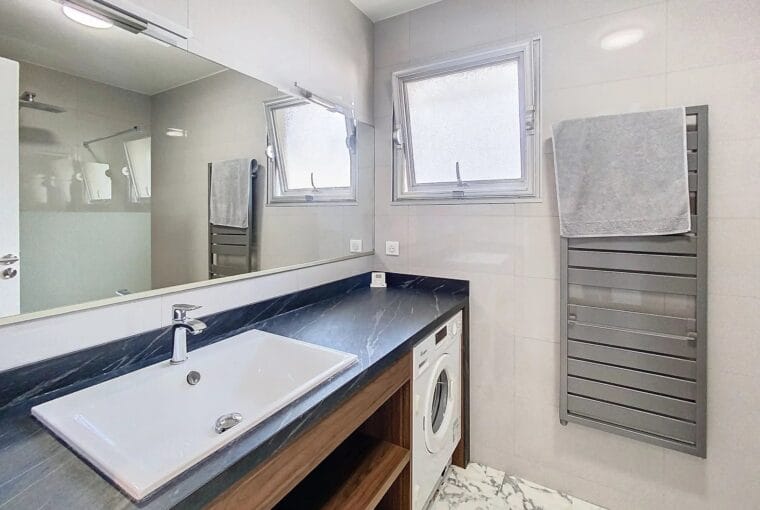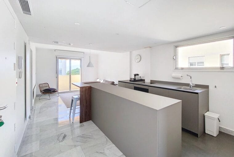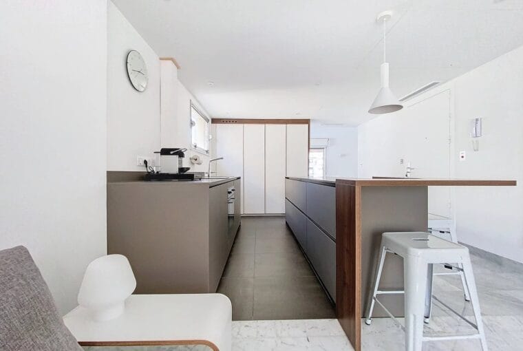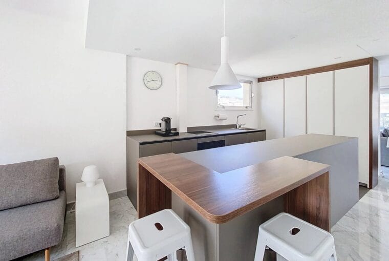 Il se compose d’un salon côté Est, d’une cuisine équipée ouverte sur un espace salle à manger côté Ouest avec un bel aperçu mer.