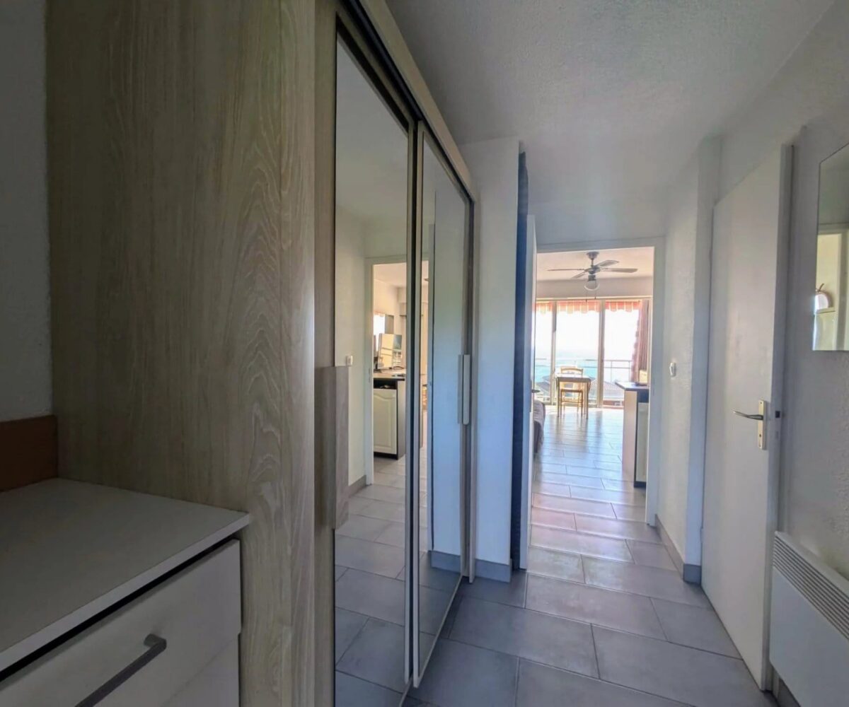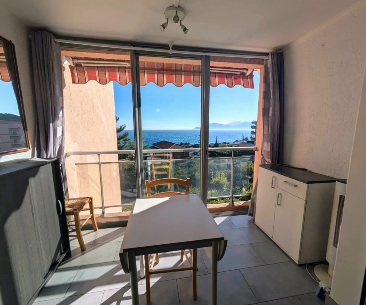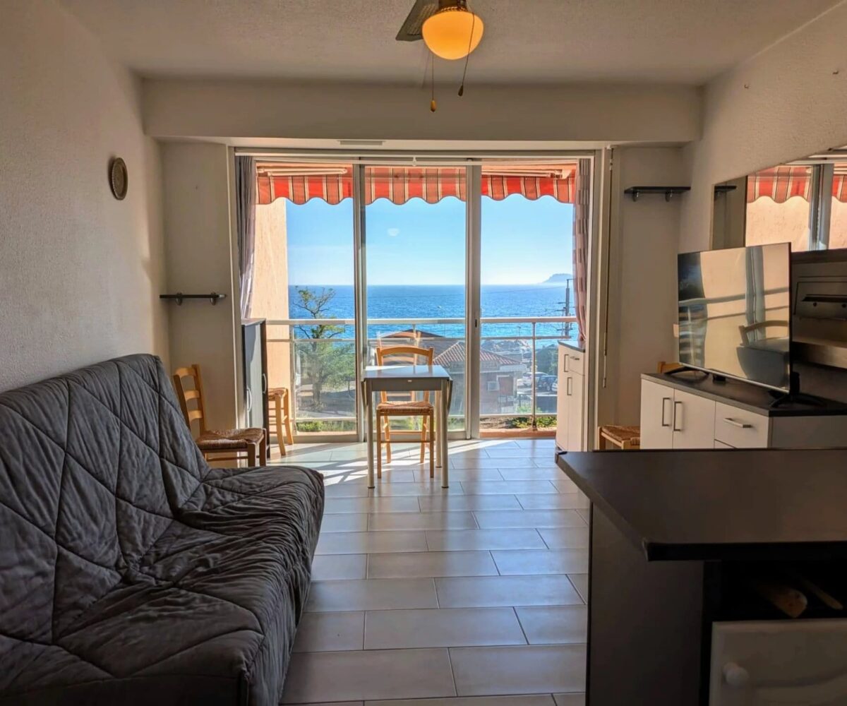 Lumineux et bien agencé, ce studio offre une pièce de vie confortable avec un coin cuisine fonctionnel, le tout orienté face à la mer. Grâce à sa grande baie vitrée, vous profitez pleinement de la lumière naturelle et d’un panorama exceptionnel sur la Méditerranée.