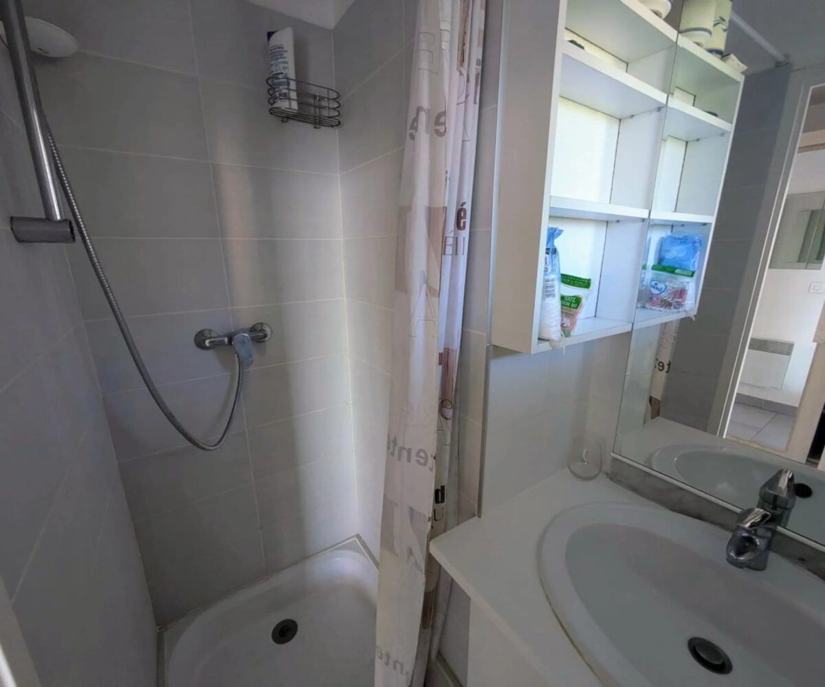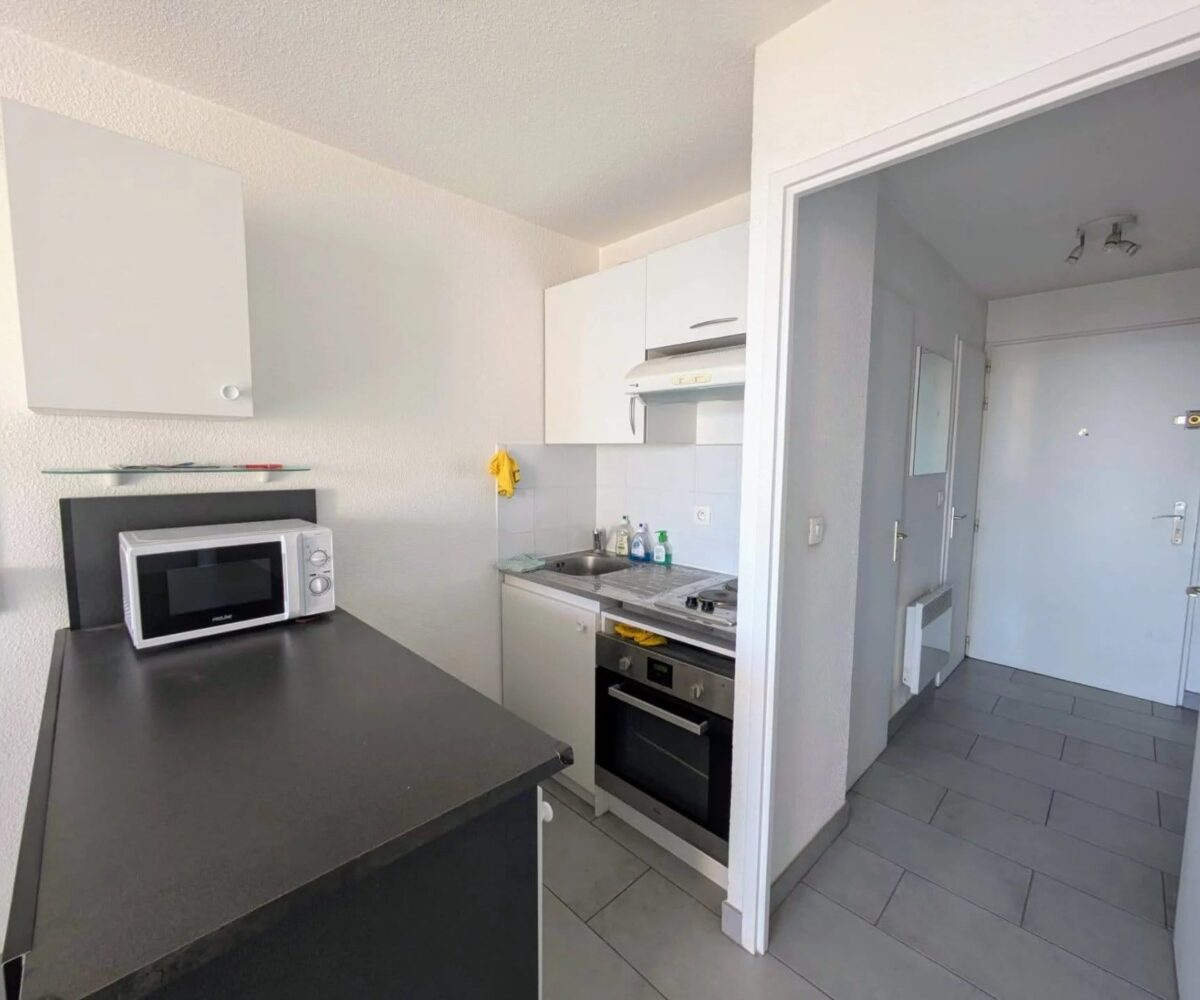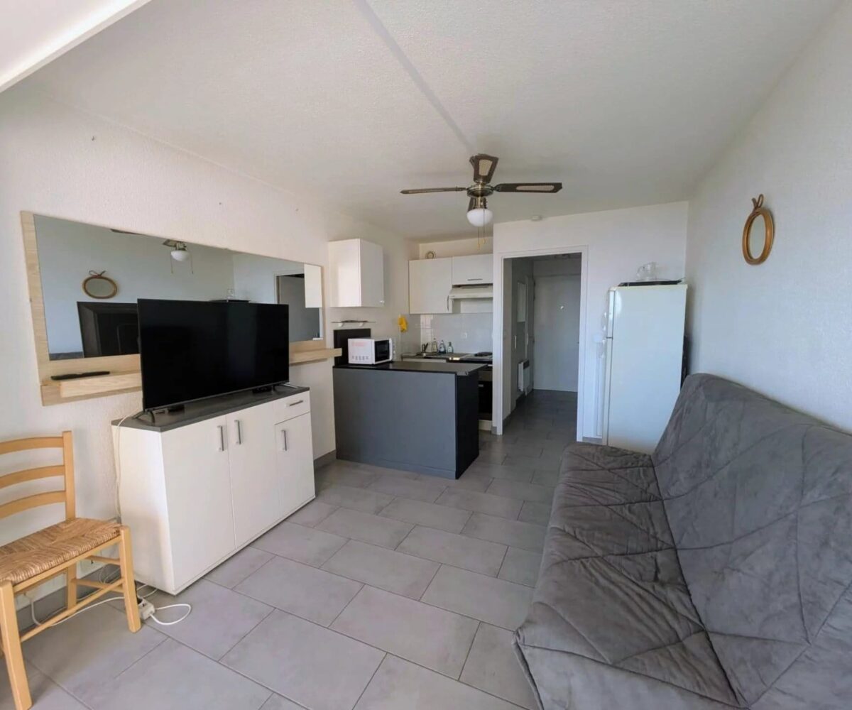 Lumineux et bien agencé, ce studio offre une pièce de vie confortable avec un coin cuisine fonctionnel, le tout orienté face à la mer. Grâce à sa grande baie vitrée, vous profitez pleinement de la lumière naturelle et d’un panorama exceptionnel sur la Méditerranée.