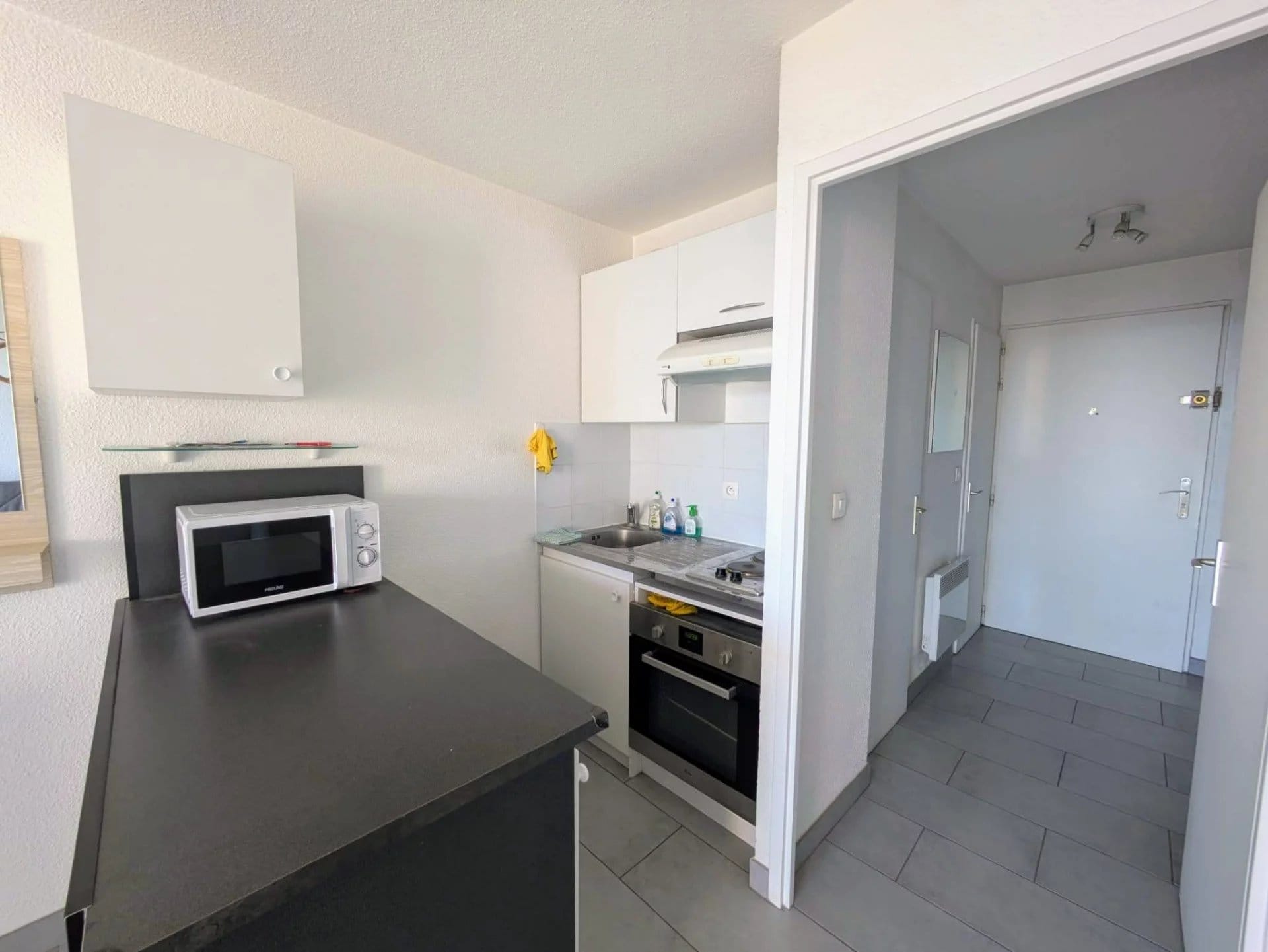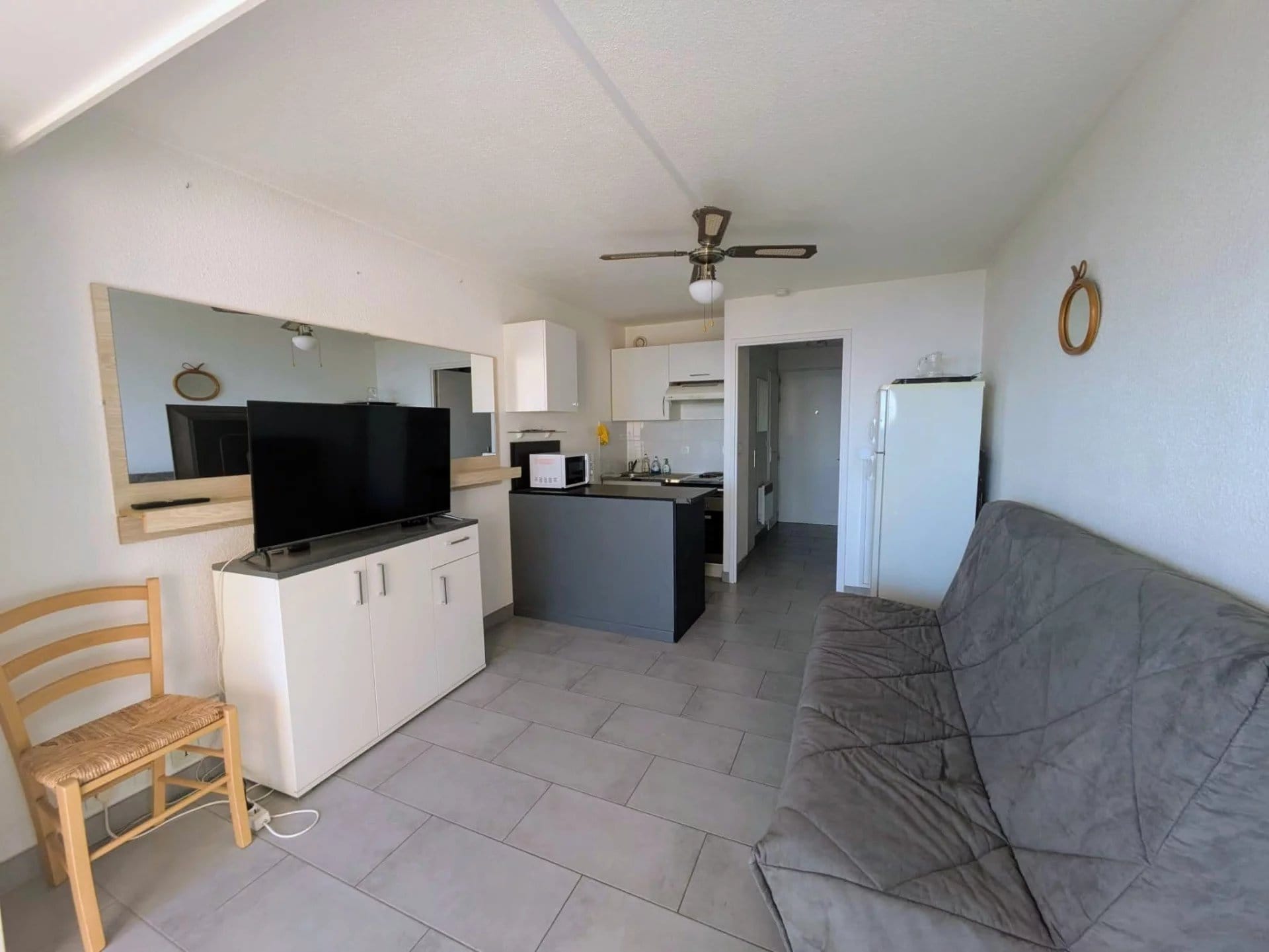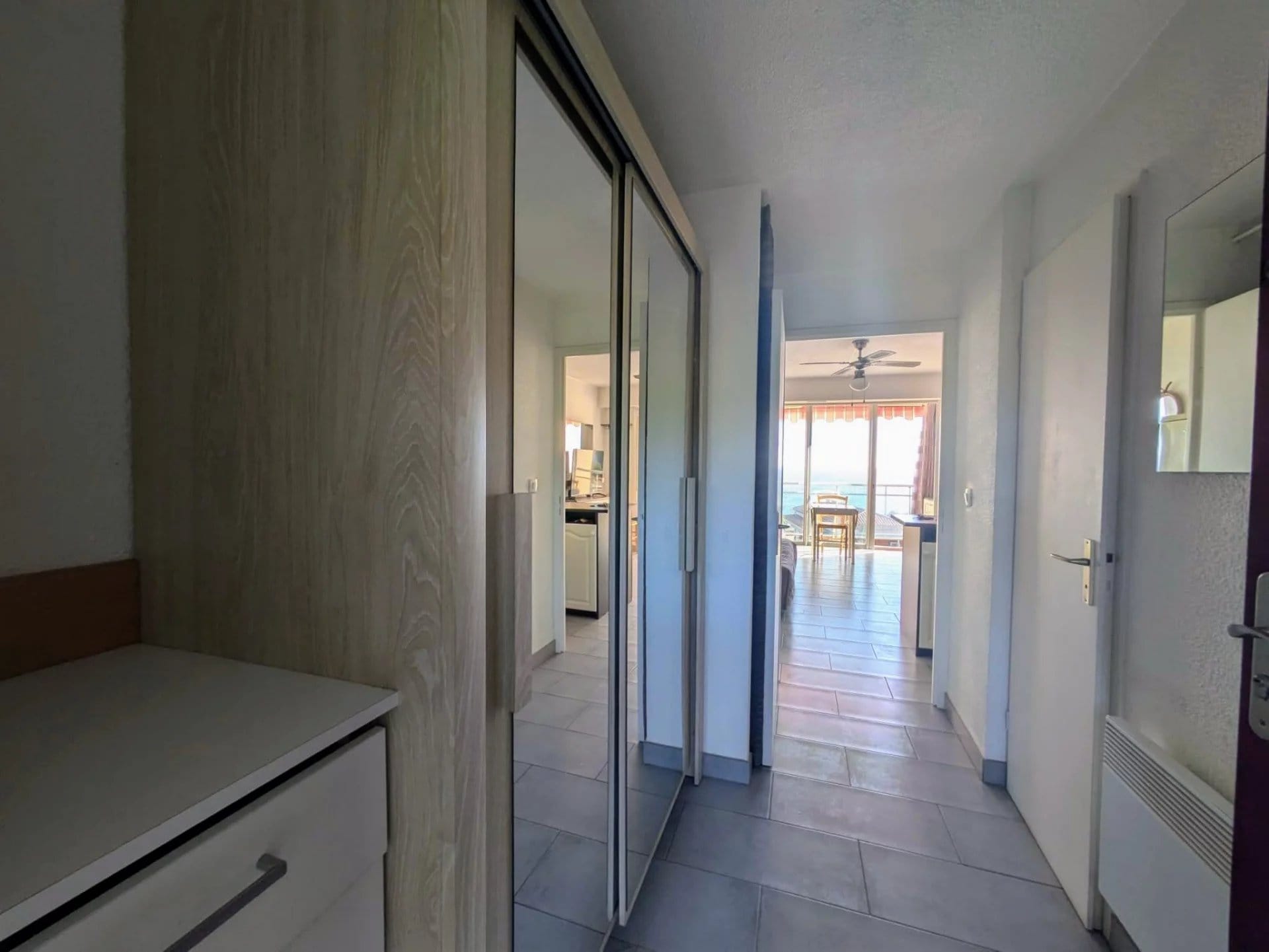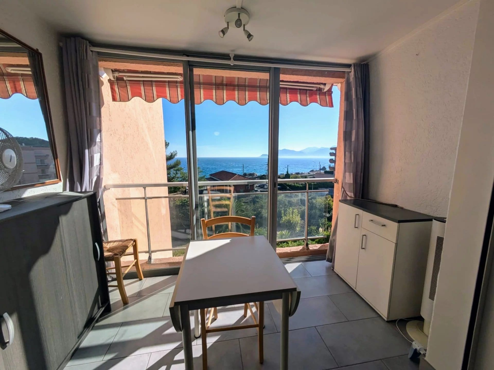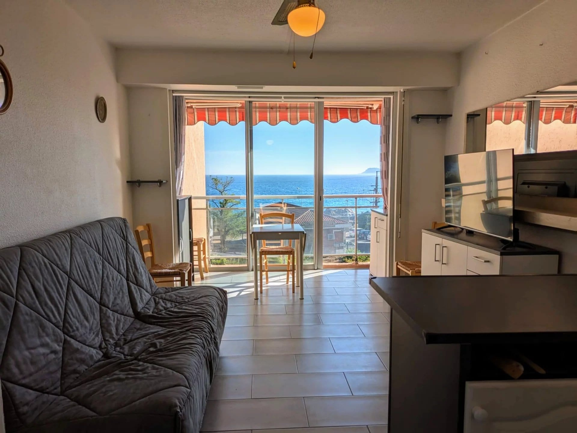 Lumineux et bien agencé, ce studio offre une pièce de vie confortable avec un coin cuisine fonctionnel, le tout orienté face à la mer. Grâce à sa grande baie vitrée, vous profitez pleinement de la lumière naturelle et d’un panorama exceptionnel sur la Méditerranée.