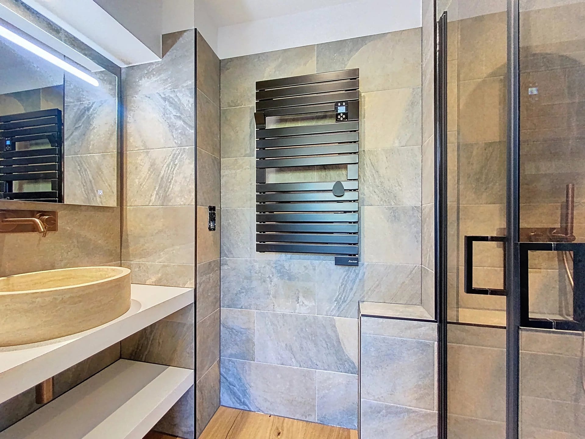 La chambre dispose de sa propre salle de douche attenante, offrant un espace nuit cosy et bien séparé. Des toilettes invités viennent compléter ce bien bien pensé, idéal aussi bien en résidence principale qu’en pied-à-terre.
