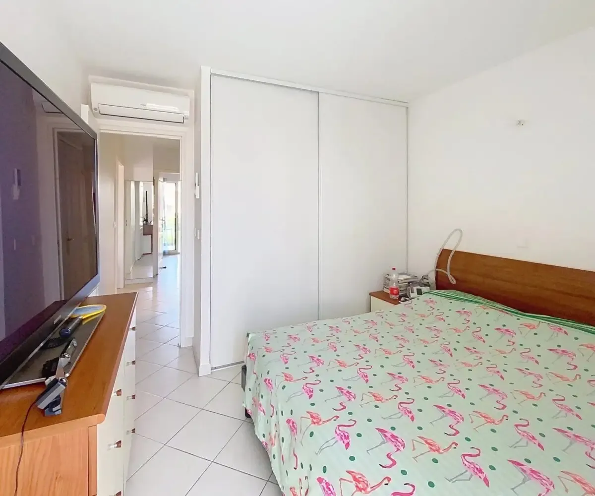 La première chambre, également orientée Sud, bénéficie d’un balcon avec aperçu mer, tandis que la seconde, côté Nord, dispose elle aussi de son propre balcon, garantissant calme et fraîcheur en été. L’espace nuit est complété par une salle de douche moderne et un toilette indépendant.