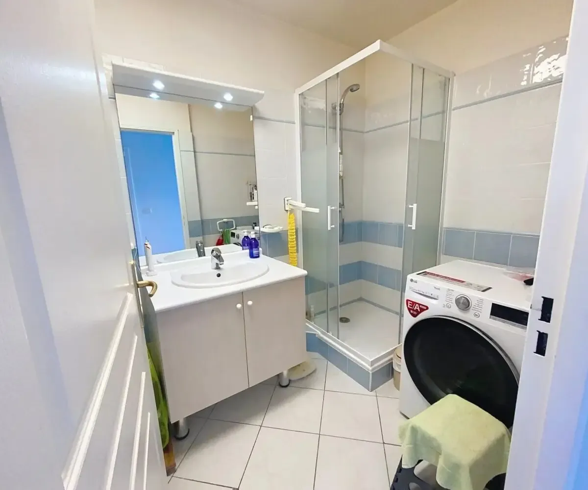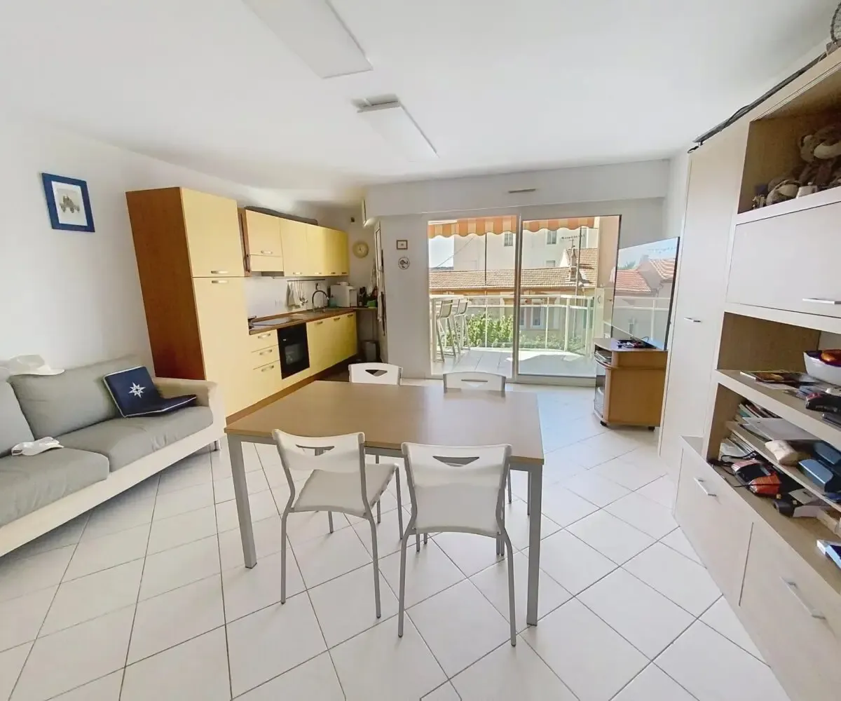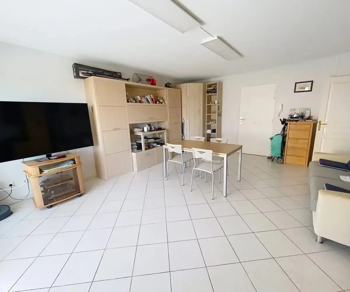 L’appartement se compose d’un séjour lumineux avec cuisine ouverte entièrement équipée, s’ouvrant sur une agréable terrasse exposée plein Sud de 7,60 m², offrant une belle vue dégagée avec aperçu mer. La pièce de vie est conviviale et fonctionnelle, idéale pour profiter de moments de détente en intérieur comme en extérieur.