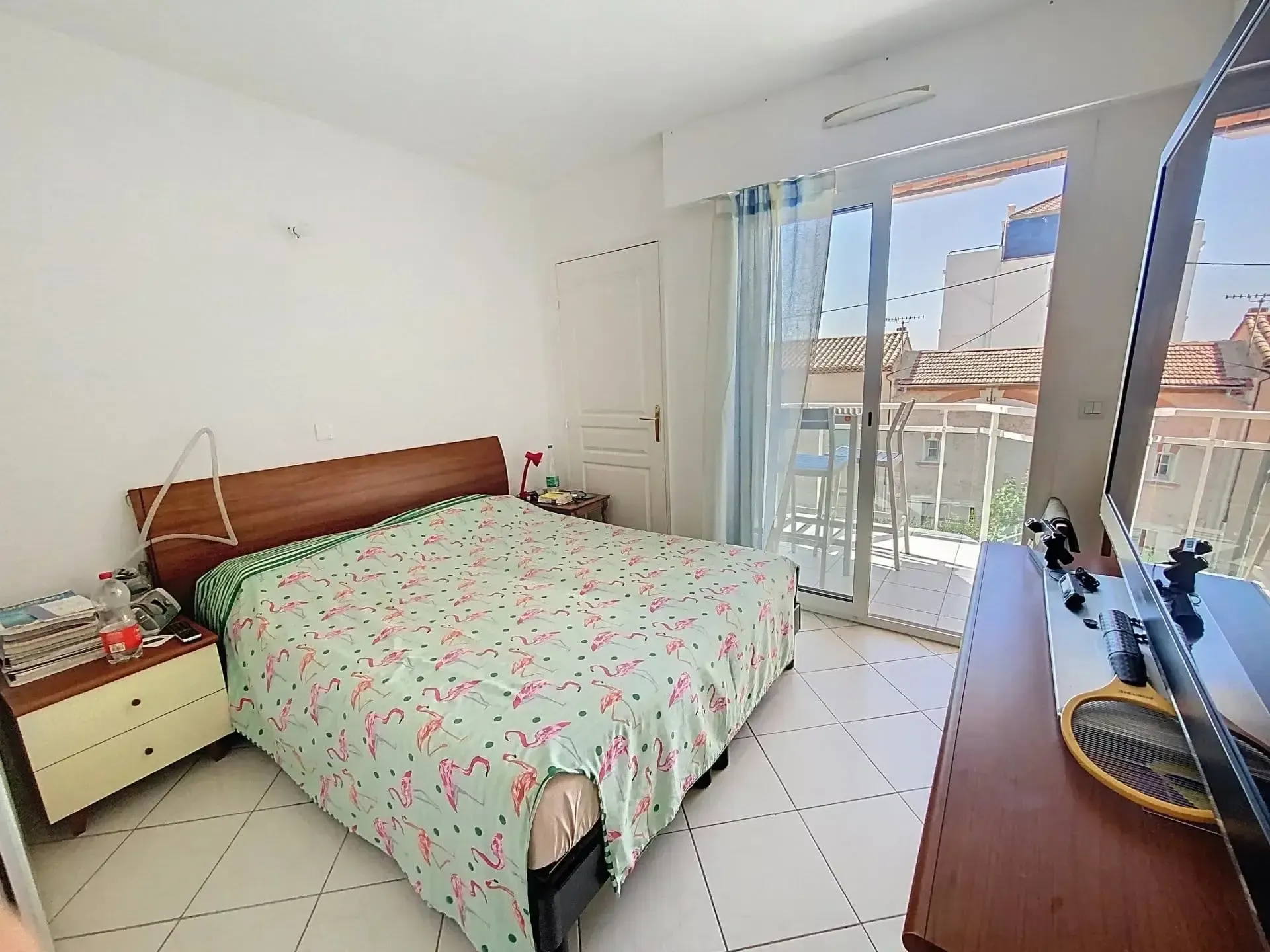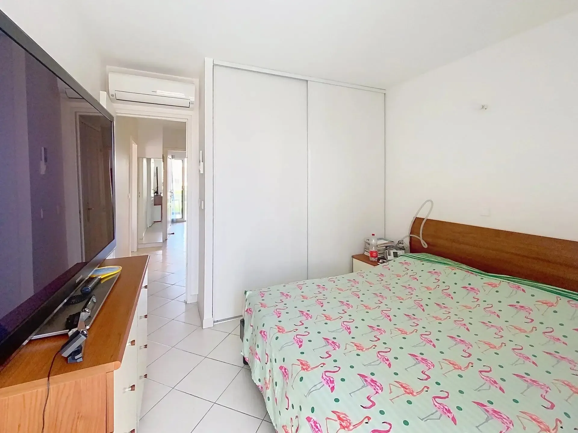 La première chambre, également orientée Sud, bénéficie d’un balcon avec aperçu mer, tandis que la seconde, côté Nord, dispose elle aussi de son propre balcon, garantissant calme et fraîcheur en été. L’espace nuit est complété par une salle de douche moderne et un toilette indépendant.