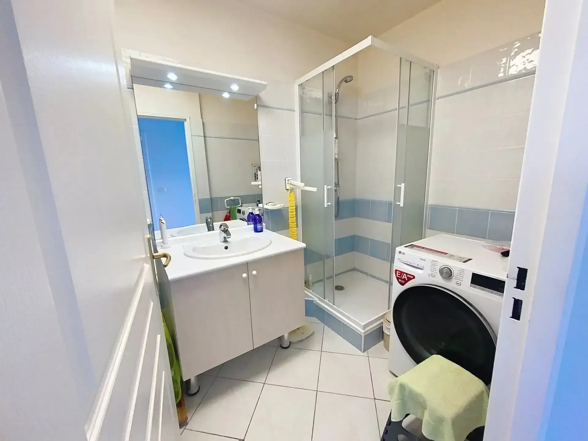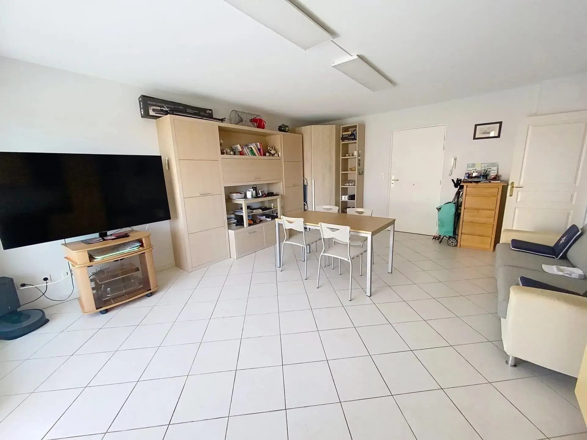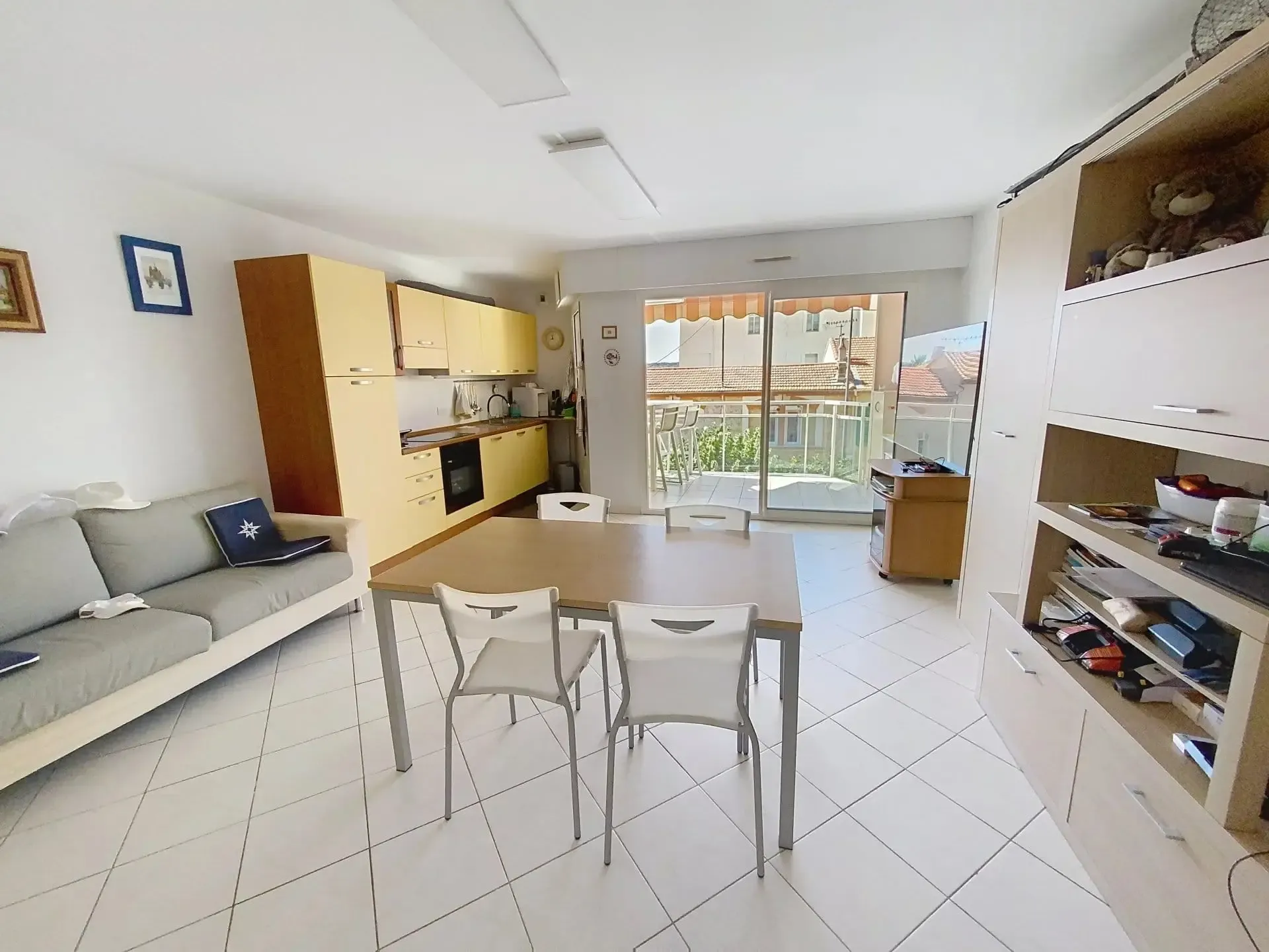 L’appartement se compose d’un séjour lumineux avec cuisine ouverte entièrement équipée, s’ouvrant sur une agréable terrasse exposée plein Sud de 7,60 m², offrant une belle vue dégagée avec aperçu mer. La pièce de vie est conviviale et fonctionnelle, idéale pour profiter de moments de détente en intérieur comme en extérieur.
