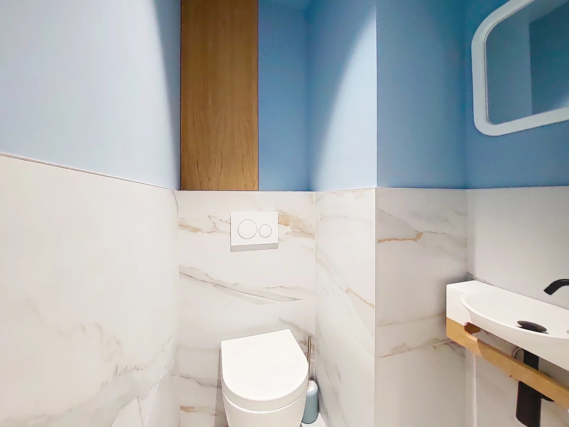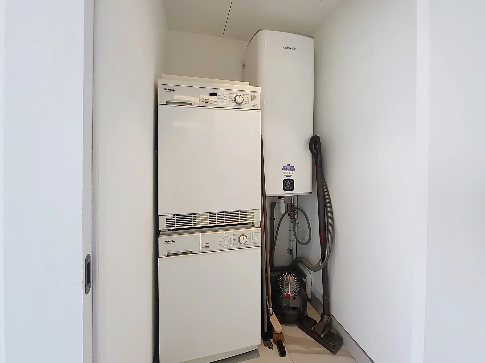 L’appartement est complété par une buanderie entièrement équipée, discrètement intégrée, ainsi que des toilettes invités, un atout supplémentaire pour le quotidien et la réception. Les prestations générales sont de grande qualité : menuiseries sur mesure pour les portes et placards, matériaux soigneusement sélectionnés, finitions soignées et atmosphère contemporaine.