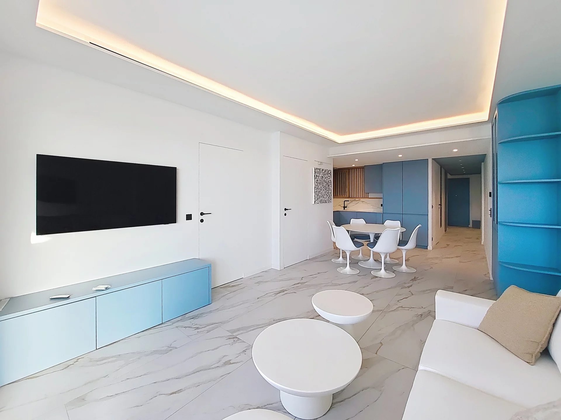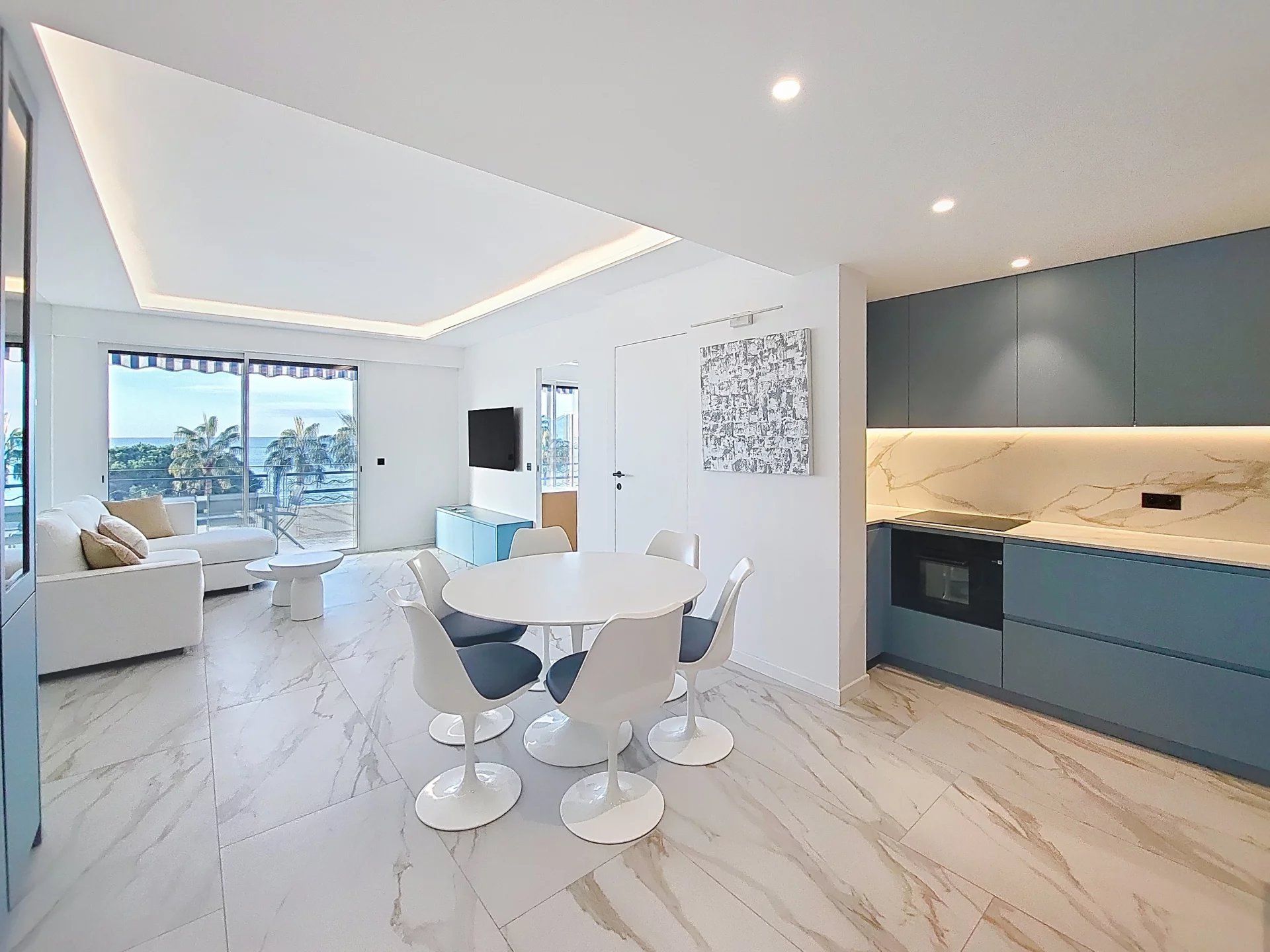 Dès l’entrée, vous découvrirez un intérieur élégant et parfaitement agencé, où chaque détail a été pensé pour offrir confort, fonctionnalité et esthétisme. L’espace de vie principal se compose d’un vaste séjour avec cuisine américaine totalisant environ 30 m². Cet espace, baigné de lumière grâce à de larges ouvertures, s’ouvre sur une superbe terrasse exposée plein Sud de 12 m². Véritable prolongement du séjour, cette terrasse offre une vue imprenable sur la Méditerranée, idéale pour profiter des levers de soleil, des déjeuners face à la mer ou des soirées douces de la Côte d’Azur.