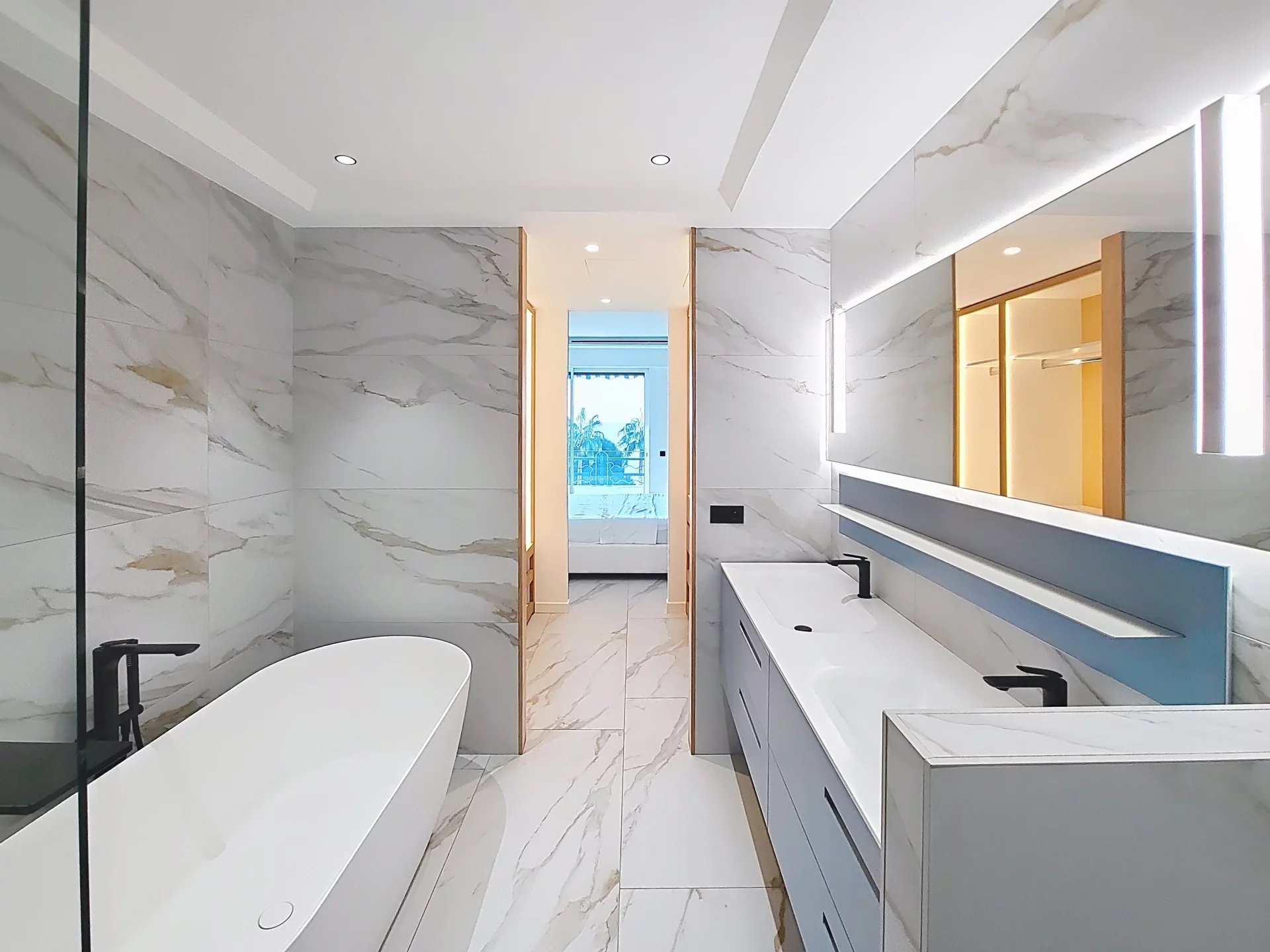 La partie nuit se compose de deux chambres en suite, offrant chacune un confort optimal et une parfaite intimité. La chambre master, véritable pièce maîtresse de l’appartement, dispose d’une magnifique vue mer, d’un dressing sur mesure et d’une salle de bain avec WC en suite. Cet espace a été conçu comme une véritable suite hôtelière, alliant élégance, calme et raffinement.