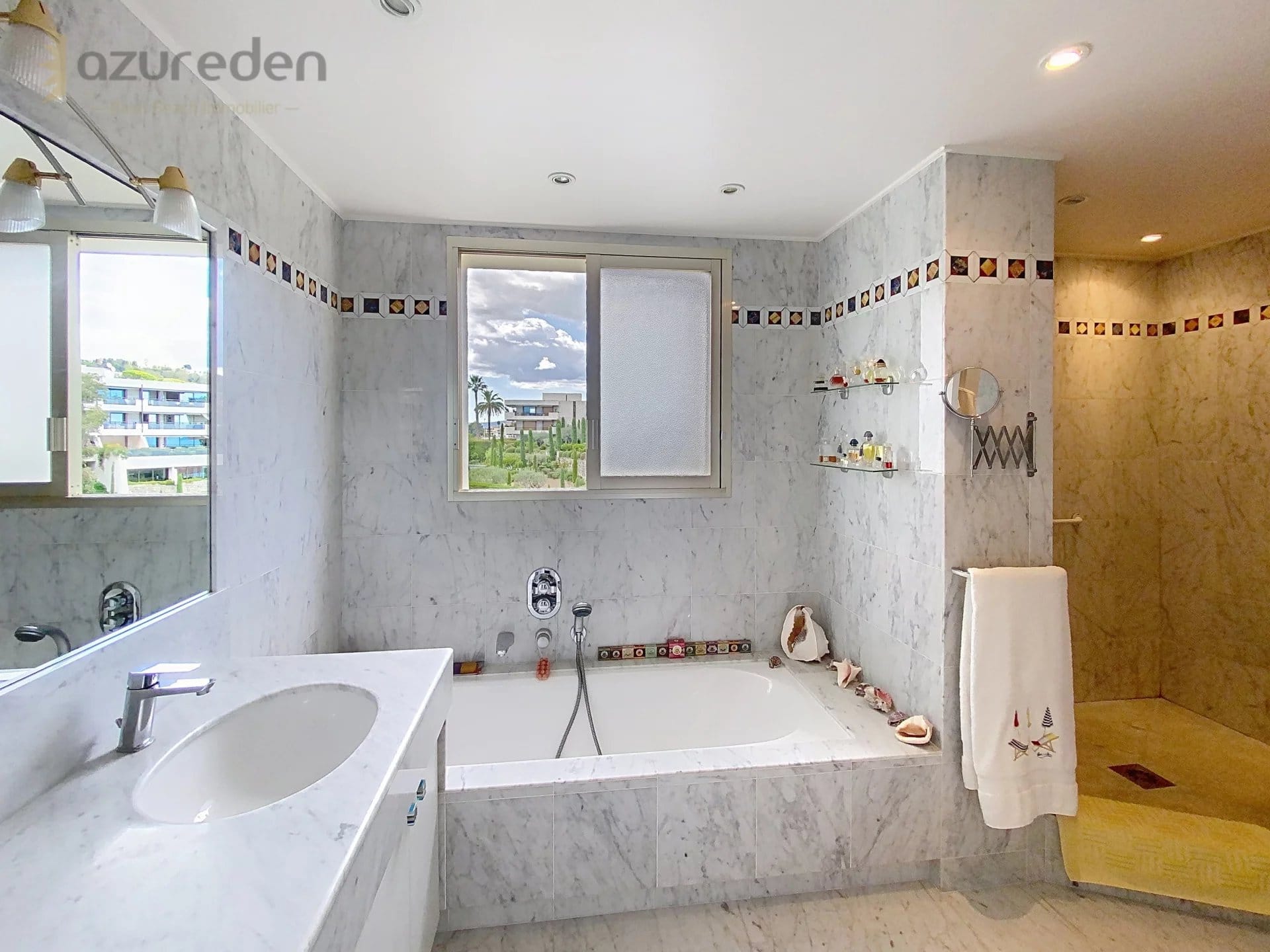 L’appartement séduit par ses volumes confortables, sa distribution fonctionnelle et sa superbe vue sur la mer et les jardins environnants. Il se compose d’un hall d’entrée, d’un séjour lumineux orienté plein Sud ouvrant sur une grande terrasse de 24 m² avec vue mer, idéal pour profiter du climat azuréen. La cuisine indépendante donne sur un balcon côté Nord.