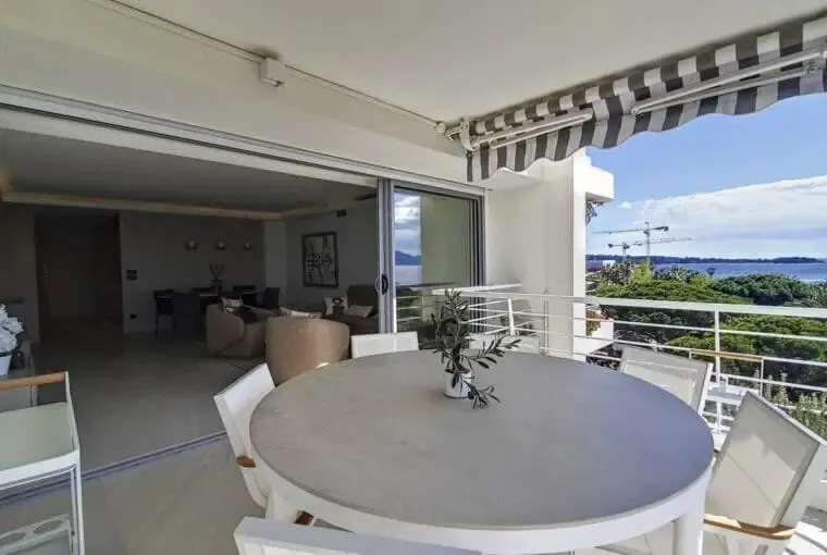 À vendre : Splendide appartement traversant de 108m², entièrement rénové, au 6ème étage d’une très belle résidence de la Pointe Croisette/Palm Beach – Superbe vue mer panoramique face à Bijou Plage.