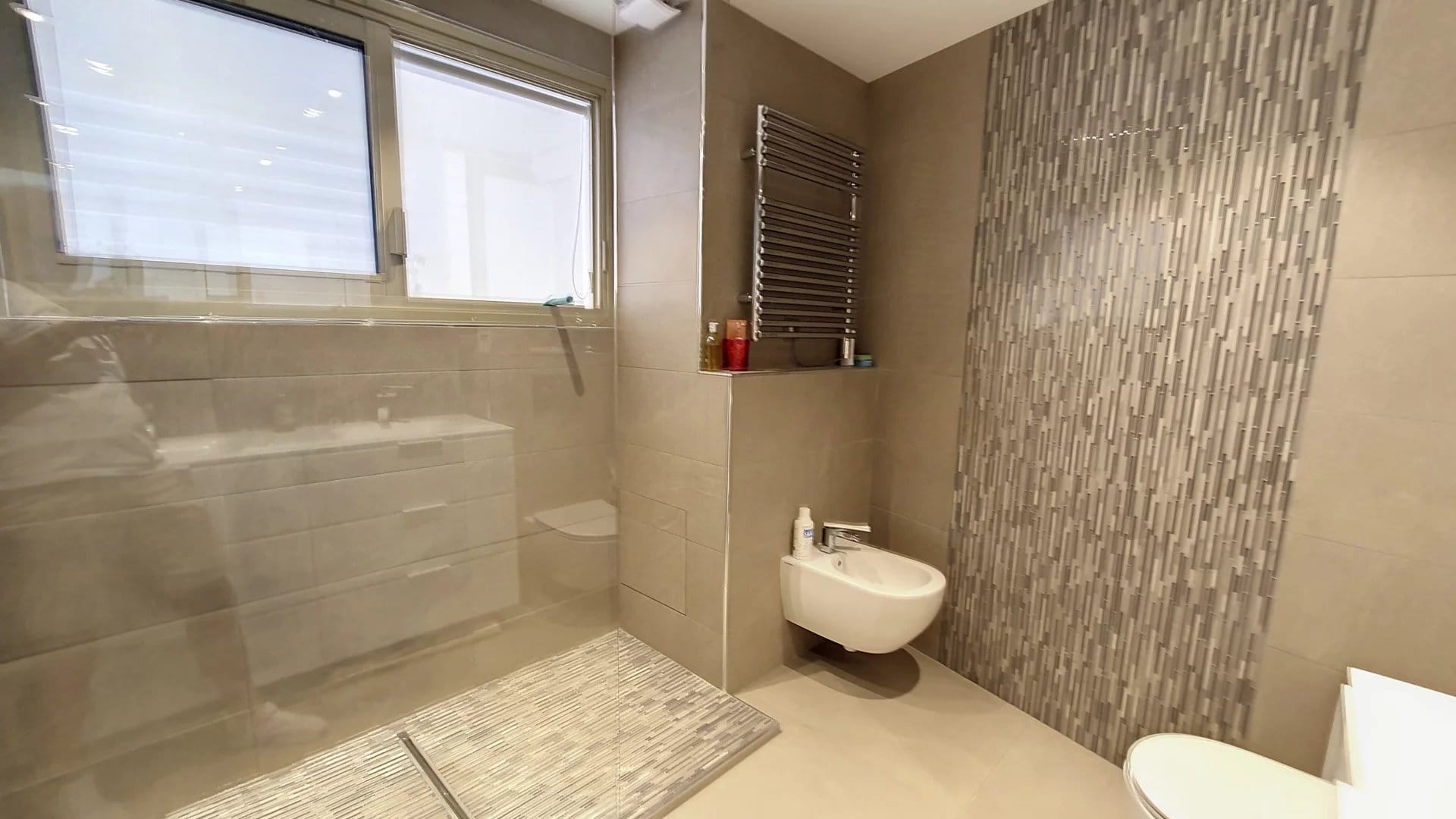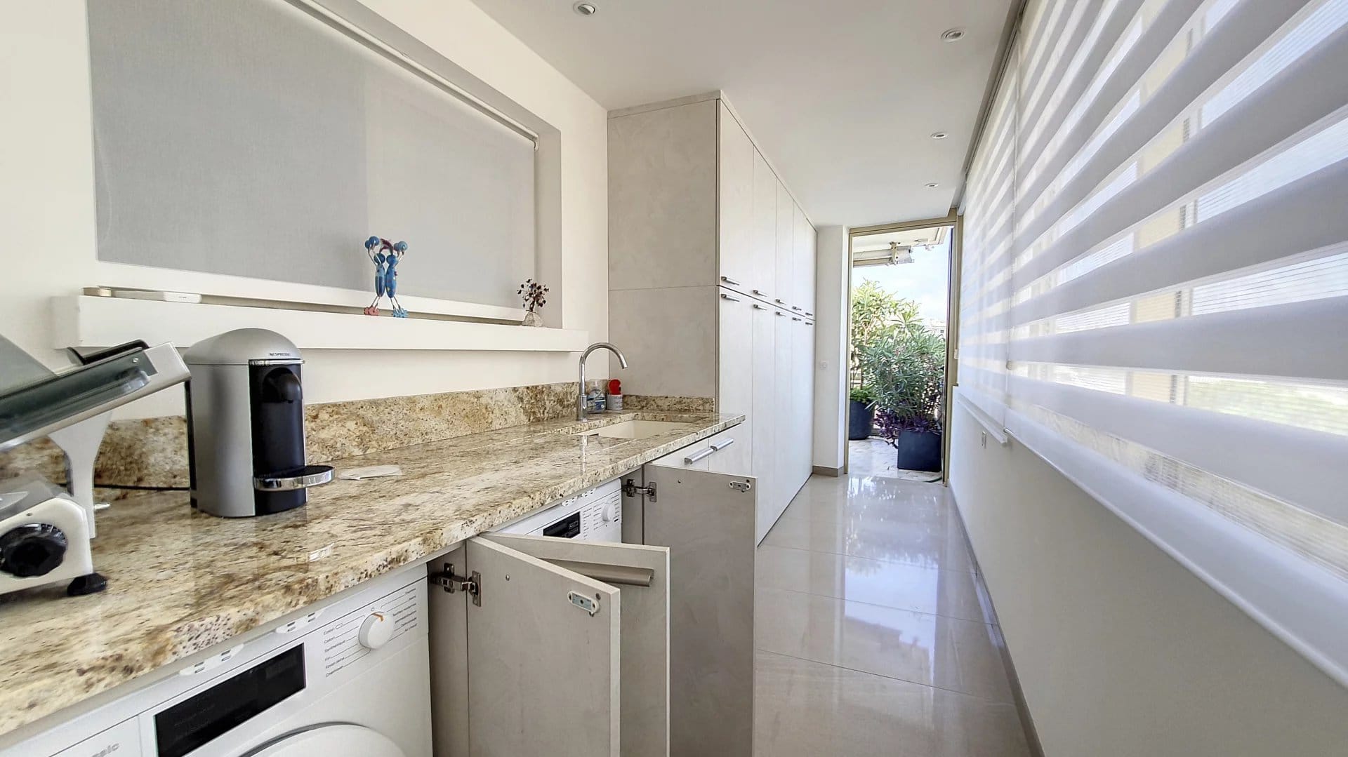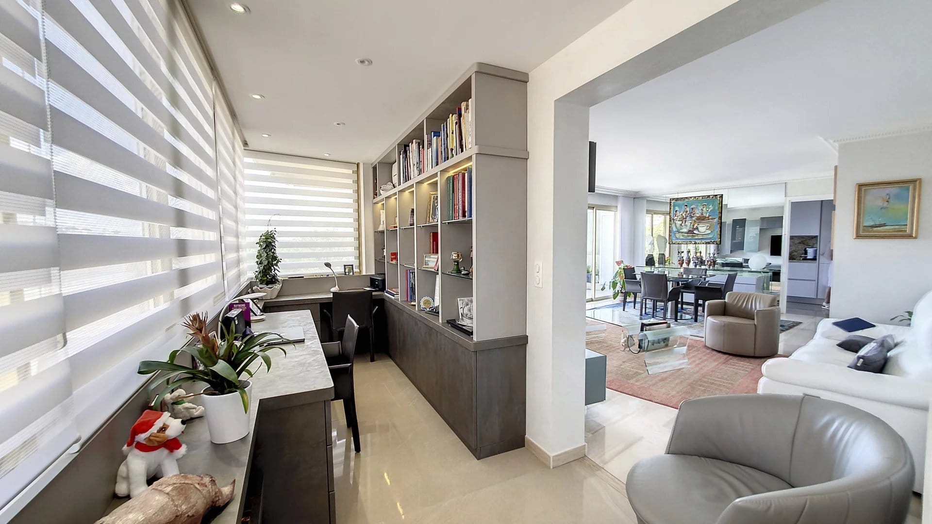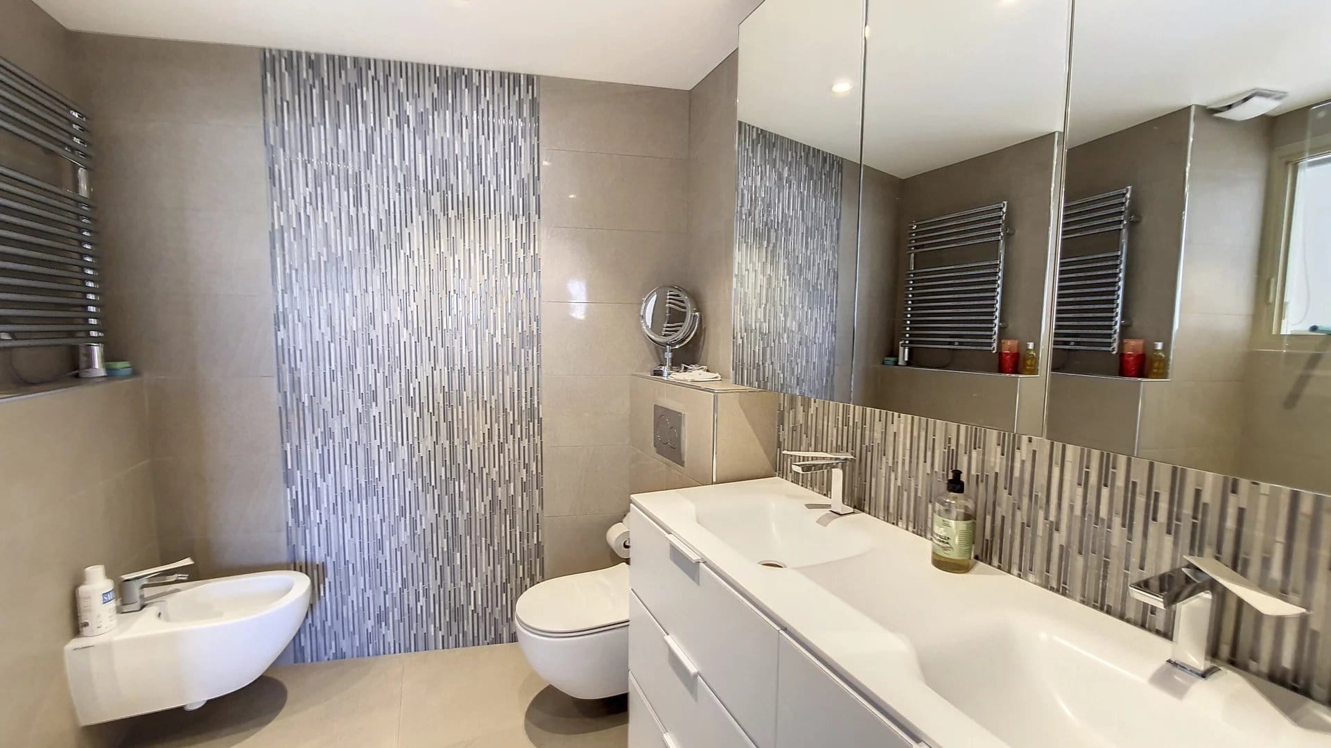 Ce magnifique T3/T4 de 101m² se compose d’une entrée, d’un vaste séjour donnant sur une très belle terrasse de 35m², d’une cuisine équipée (donnant également sur la terrasse Est), d’une buanderie et d’un grand bureau/bibliothèque. Côté Ouest, 2 chambres en suite, donnant sur une vaste terrasse de 32m², avec chacune leur salle de douche et d’un toilette indépendant.