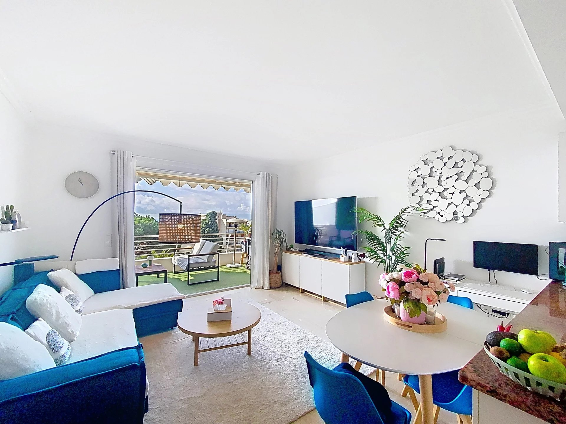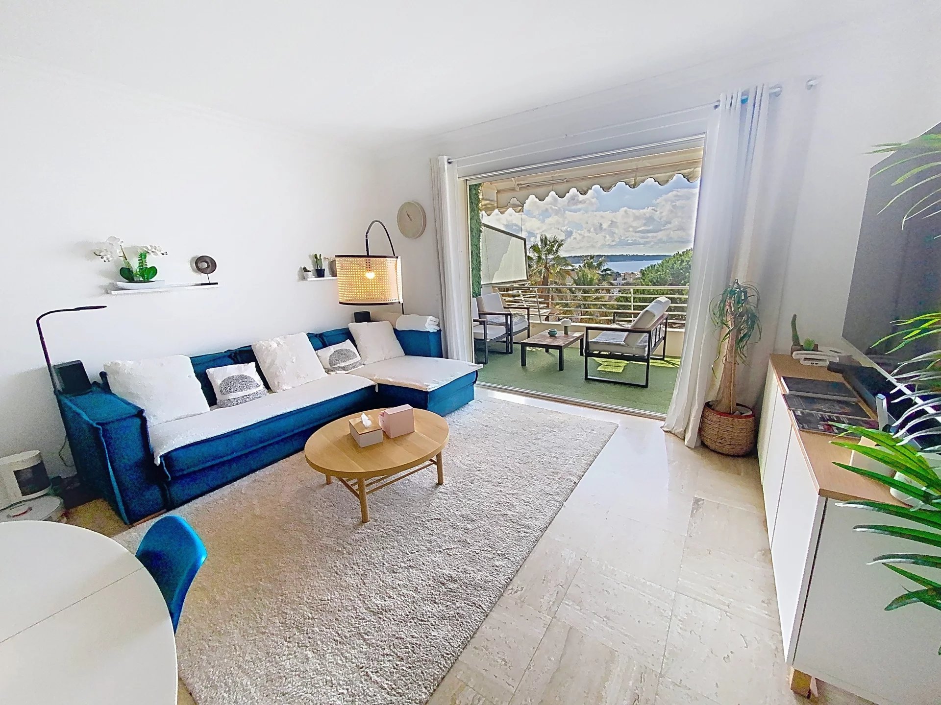 Grâce à son exposition plein Sud, le séjour profite d’un ensoleillement optimal tout au long de la journée. Une large ouverture permet d’accéder à une agréable terrasse de 9 m², véritable atout de l’appartement. Depuis cet espace extérieur, vous pourrez admirer une vue panoramique sur la mer, embrassant les mythiques Îles de Lérins ainsi que le massif de Massif de l’Estérel. Ce panorama exceptionnel offre un décor naturel unique, entre bleu azur et reliefs rouges caractéristiques de la région, et invite à profiter pleinement des douces soirées méditerranéennes.