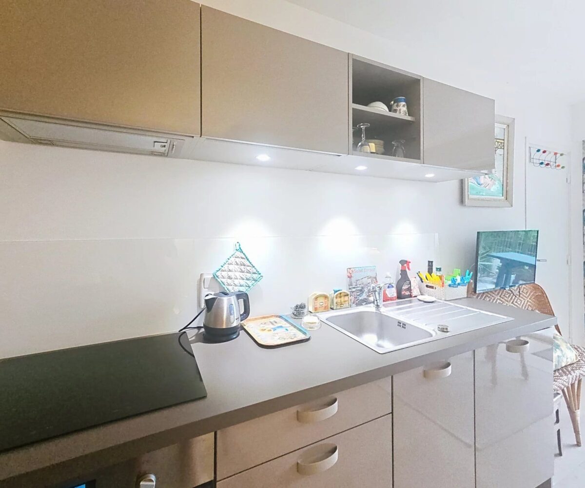 Climatisé et fonctionnel, ce studio se distingue par son aménagement astucieux, avec un coin nuit séparé qui permet d’accueillir un couple avec un jeune enfant. L’ensemble a été pensé pour maximiser le confort et l’usage au quotidien ou lors des séjours saisonniers.