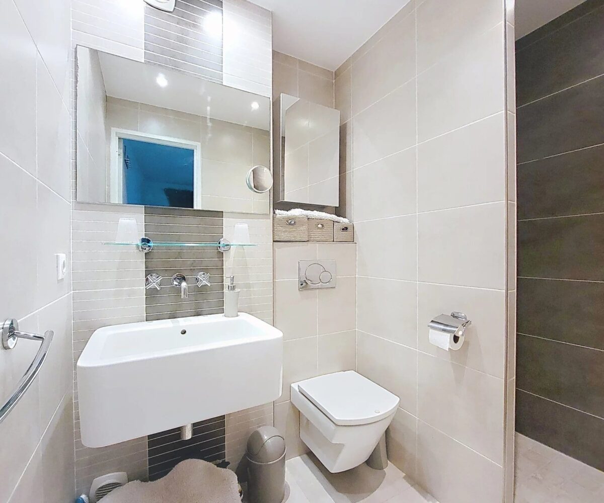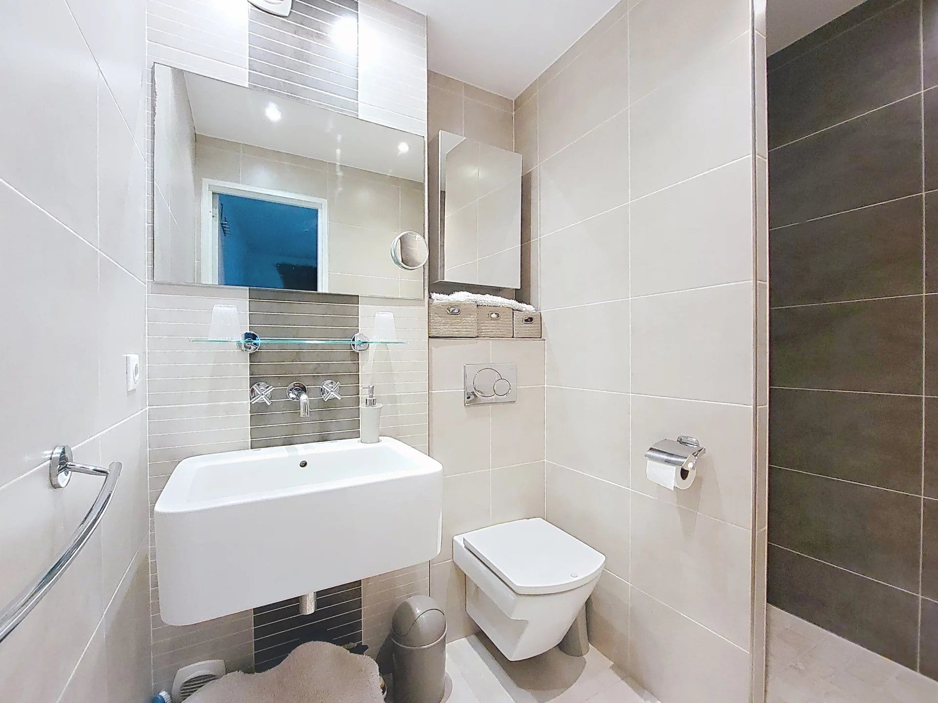 La chambre, spacieuse et lumineuse, bénéficie également d’un accès direct à la terrasse, créant une belle continuité entre les espaces intérieurs et extérieurs. Une salle de bain moderne ainsi que des toilettes invités complètent cet appartement parfaitement agencé.