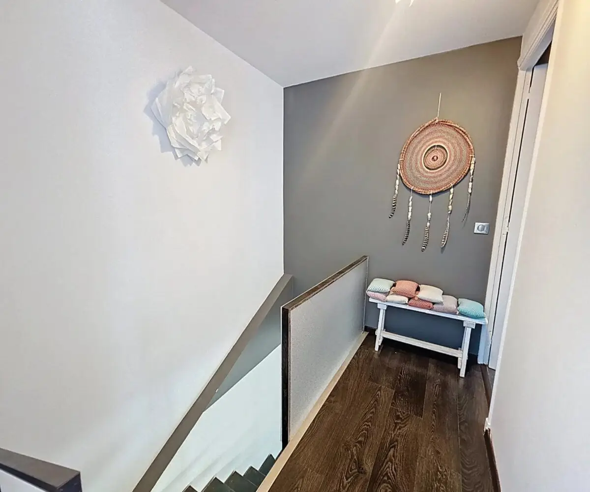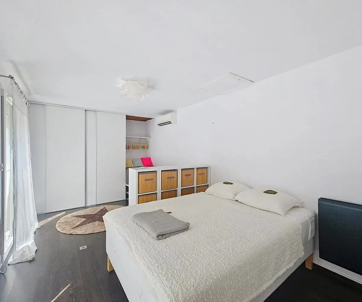 À l’étage, une grande chambre avec salle de bains/WC attenante ouvre sur une spacieuse terrasse. Une configuration permettant également la création d’une deuxième chambre selon vos besoins.