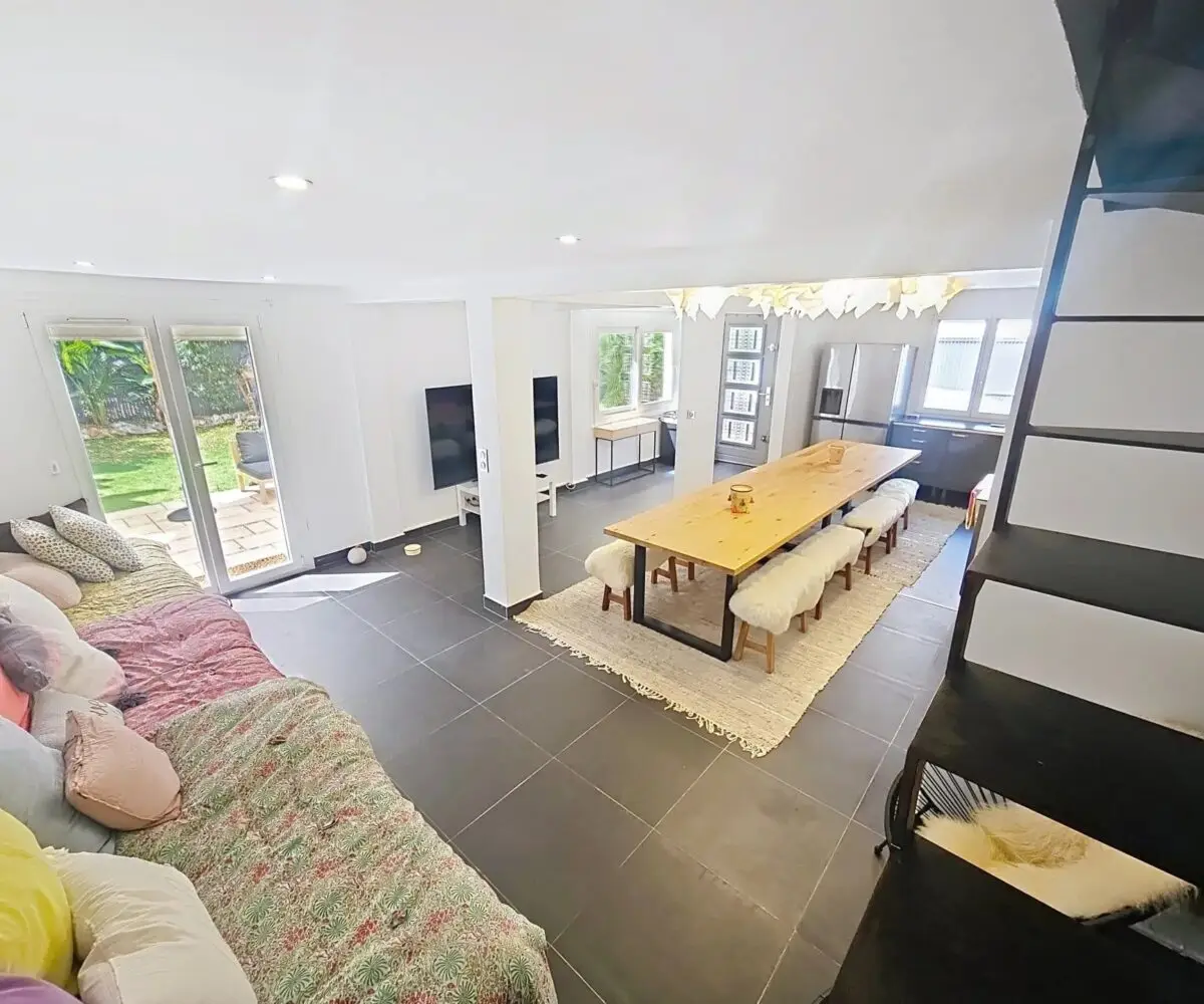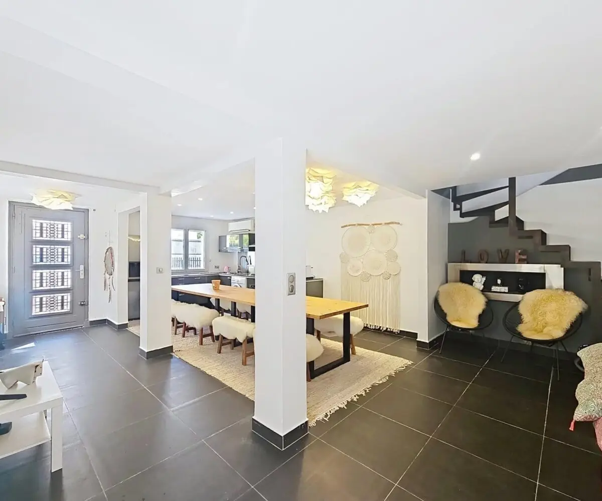 La maison se développe sur deux niveaux. Au rez-de-chaussée, vous découvrirez un vaste séjour lumineux avec cuisine ouverte, s’ouvrant sur une belle terrasse et un jardin arboré de 100 m² exposé plein Sud. Cet espace extérieur, rare dans le secteur, est idéal pour profiter du climat méditerranéen en toute tranquillité.