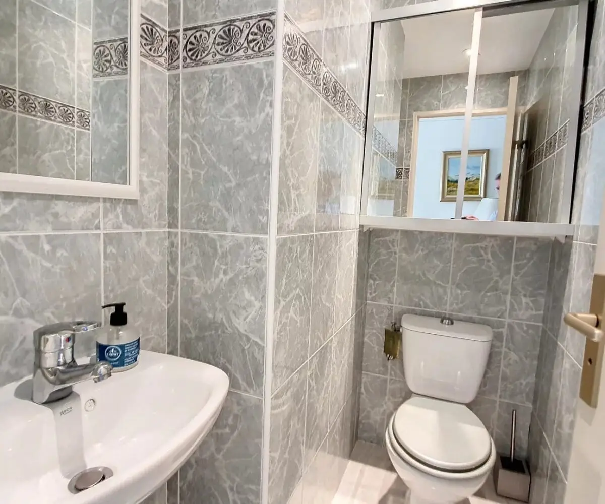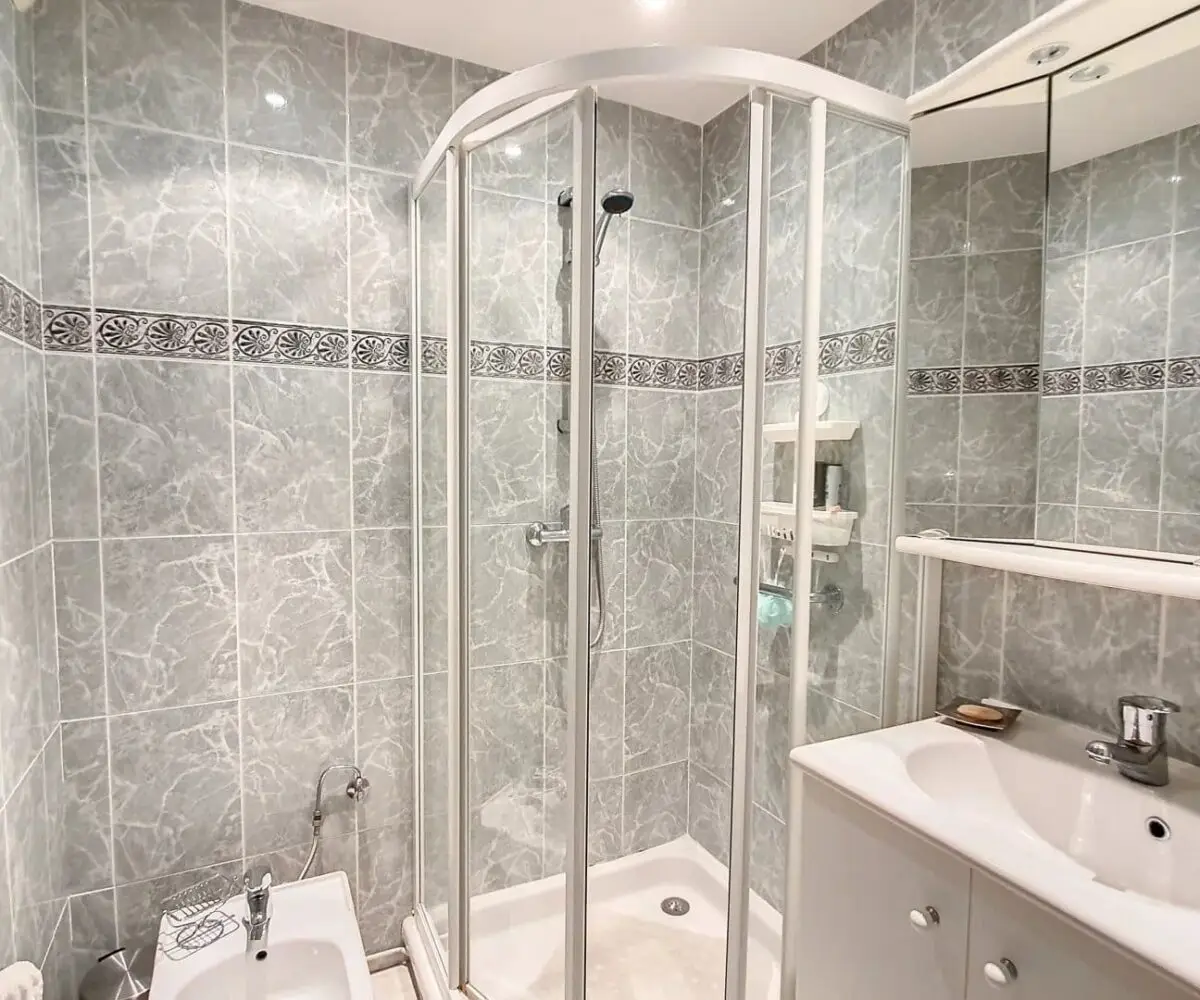 Il se compose d’une entrée, d’un vaste salon/salle à manger avec cuisine ouverte, 2 chambres en suite (l’une avec salle de bain, l’autre avec salle de douche), d’1 bureau (ou chambre d’appoint), 2 toilettes indépendants et de nombreux rangements.