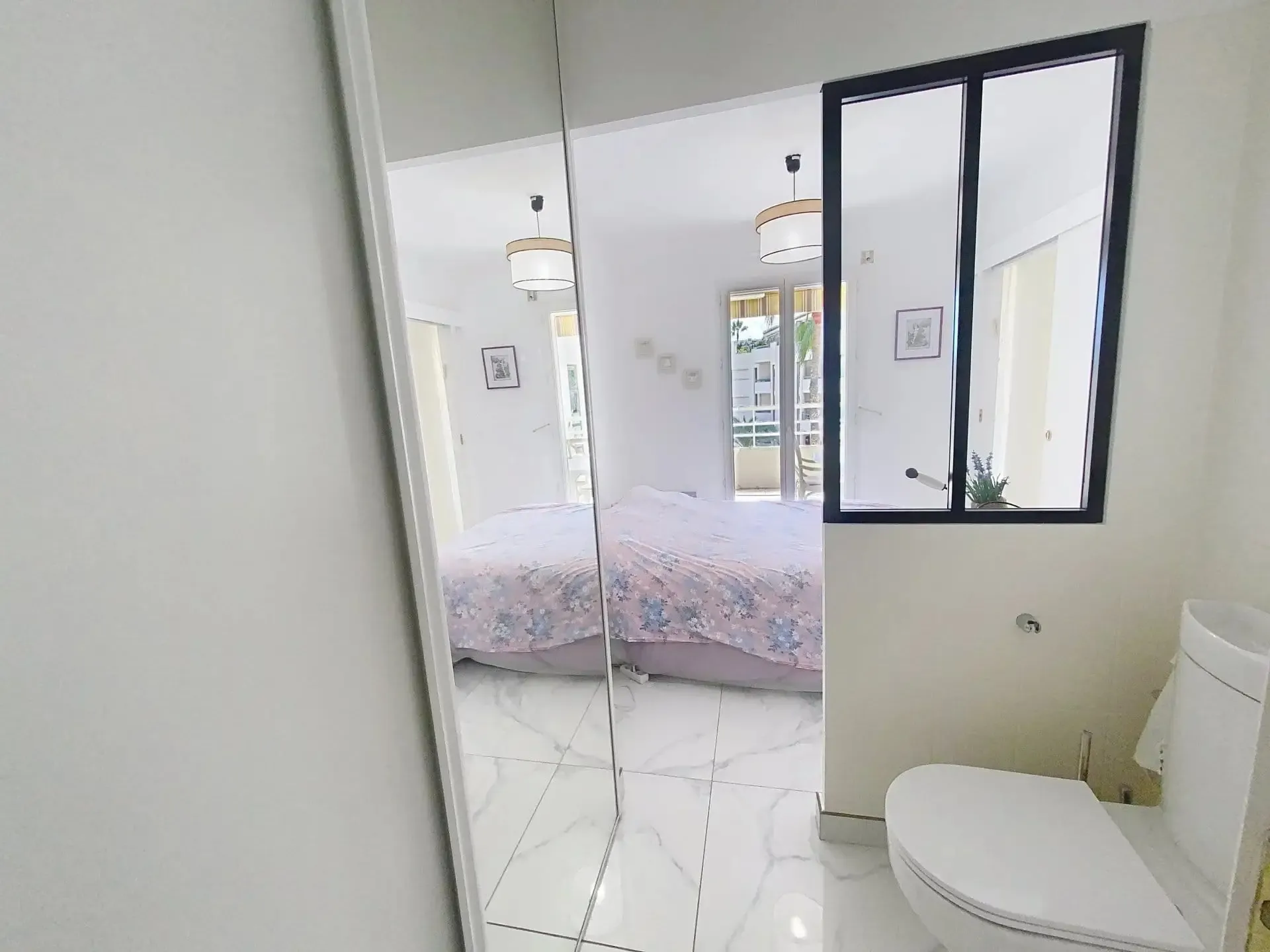 La chambre, équipée d’un placard de rangement, dispose de toilettes intégrées pour plus de confort. Une salle de douche moderne avec toilettes supplémentaires vient compléter l’espace nuit.