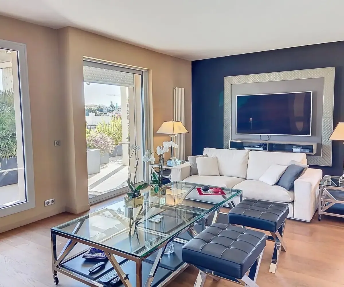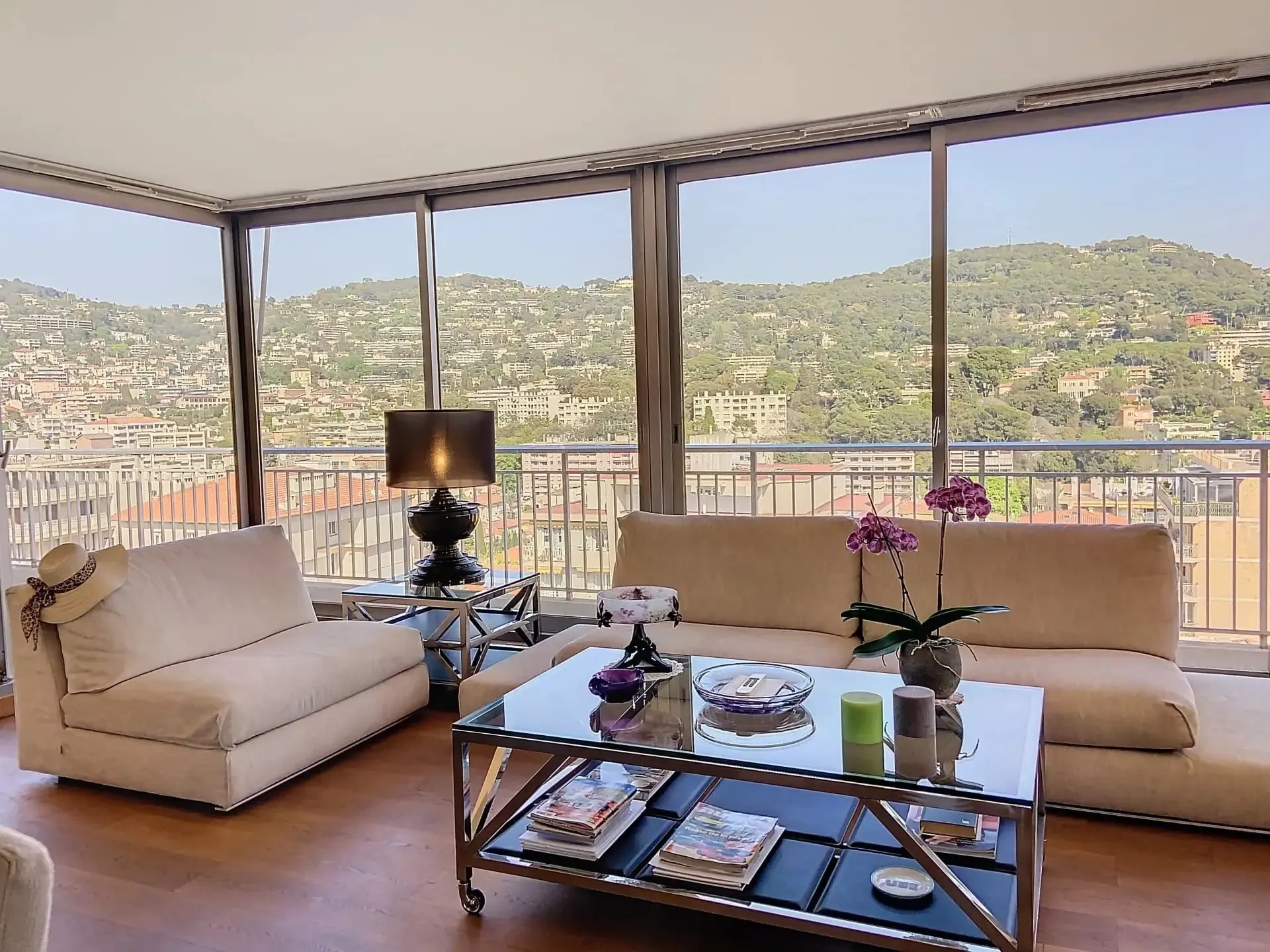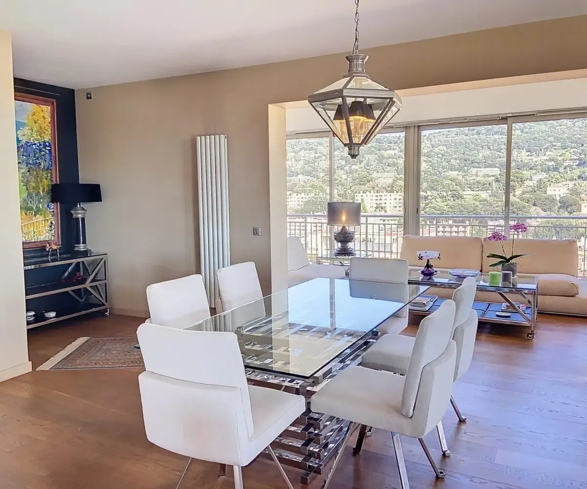 Situé aux portes de Cannes, dans un quartier résidentiel proche de toutes commodités, ce magnifique appartement 5 pièces de 165 m² occupe tout le dernier étage d’une résidence de standing. Il bénéficie d’une exceptionnelle terrasse arborée de 164 m², véritable jardin suspendu avec vue panoramique sur les collines de la Californie à l’Est, et un aperçu mer au Sud.