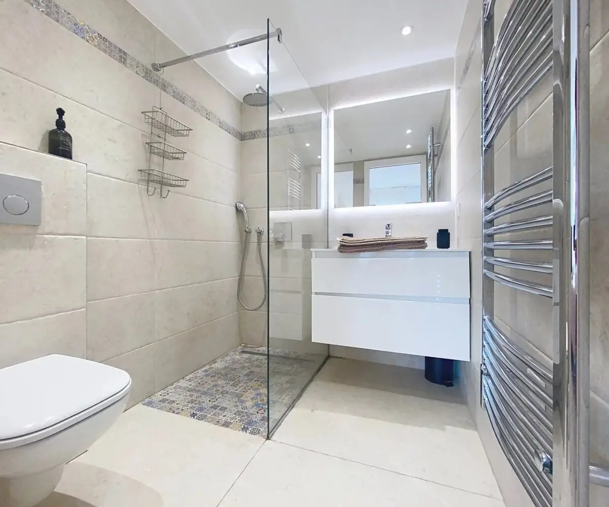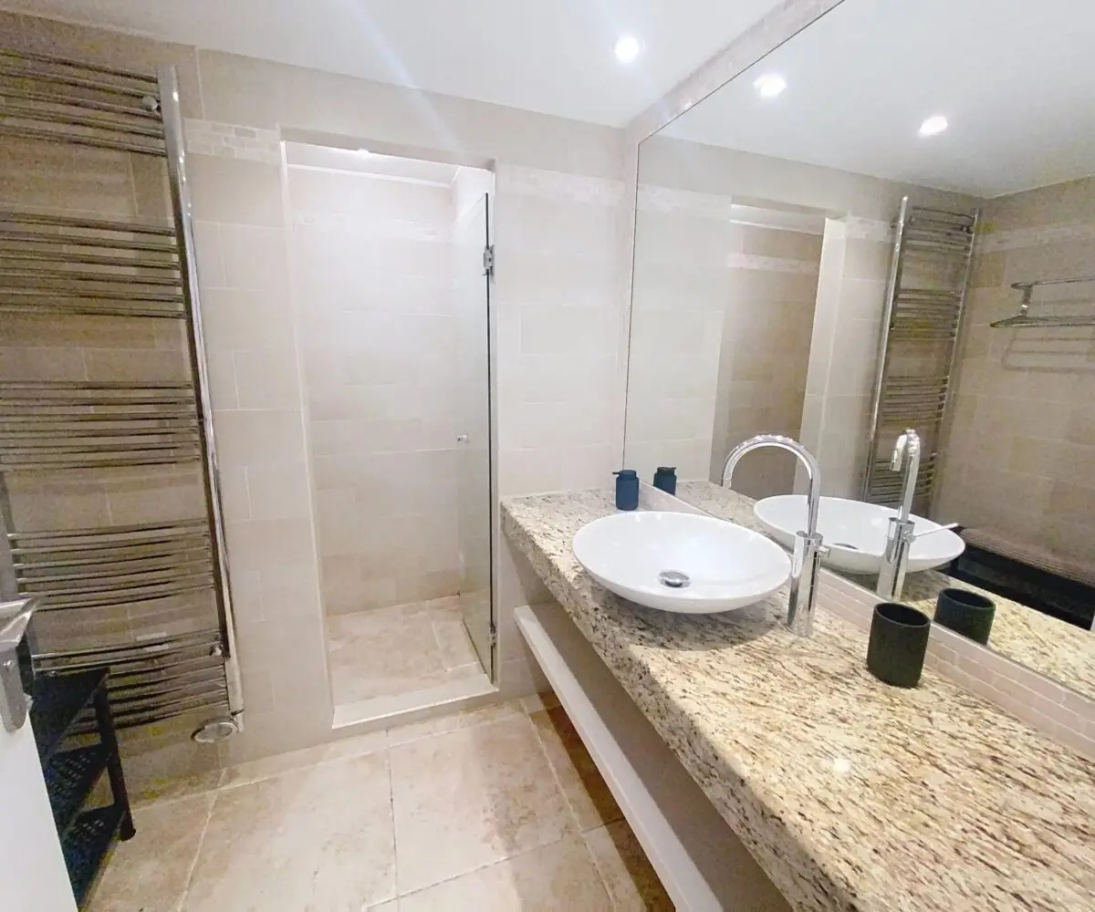 Le séjour spacieux s’ouvre sur cette agréable terrasse, invitant à la détente et à la convivialité. La cuisine, semi-ouverte, allie fonctionnalité et modernité, créant une belle harmonie avec la pièce de vie. L’appartement dispose de deux grandes chambres, chacune offrant de beaux volumes et un excellent confort. Deux salles de douche avec WC assurent une réelle praticité au quotidien, en plus du toilette indépendant.